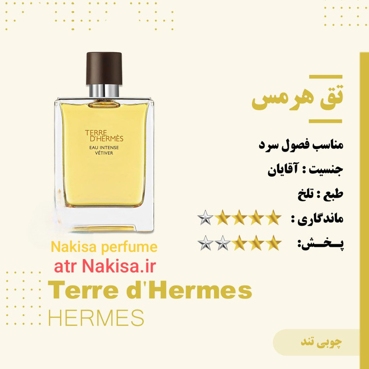 عطر Terre d’Hermes یکی از عطرهای اصیل، شیک و بسیار محبوب برند هرمس (Hermes) است که با ترکیبی متوازن از نتهای مرکباتی، چوبی، خاکی و ادویهای، برای آقایان طراحی شده که به دنبال قدرت طبیعی، ظرافت مردانه و حضور قابلاعتماد هستند. این عطر در دستهبندی دیزاینری لاکچری قرار میگیرد و شخصیت آن بالغ، متفکر، باوقار و مدرن است؛ عطری که شما را به دنیایی از ارتباط با طبیعت، اعتمادبهنفس و جذابیت مینیمال میبرد.