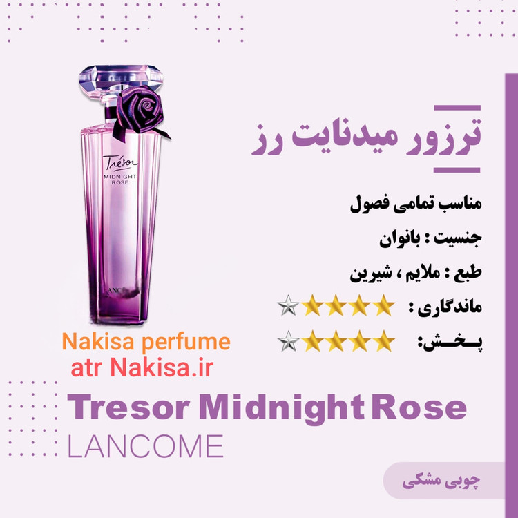 وقتی شب، رنگ بنفش خیالانگیز خود را به آسمان میپاشد و عطر گلها در هوای خنک جاری میشود، Trésor Midnight Rose از برند فاخر Lancôme به زیبایی هر چه تمامتر، حس لطیف عشق را در قالب رایحهای فراموشنشدنی بازگو میکند. این عطر زنانه در سال 2011 توسط عطرساز معروف Anne Flipo خلق شد و بهسرعت جایگاه ویژهای میان زنان عاشق رایحههای شاعرانه و اغواگر پیدا کرد.
